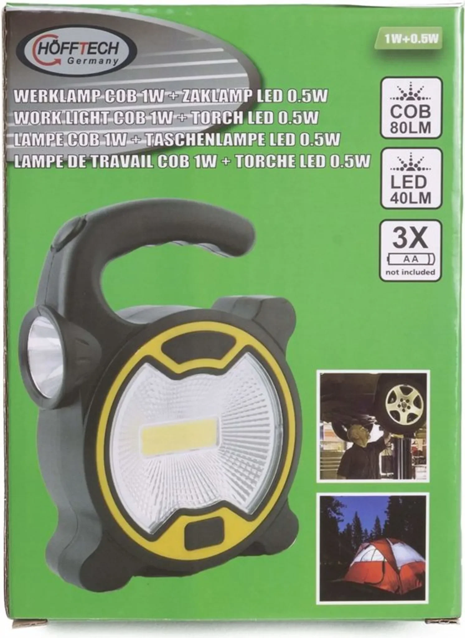 1 W COB-Arbeitslicht • 0,5 W LED-Taschenlampe • Batteriebetrieben