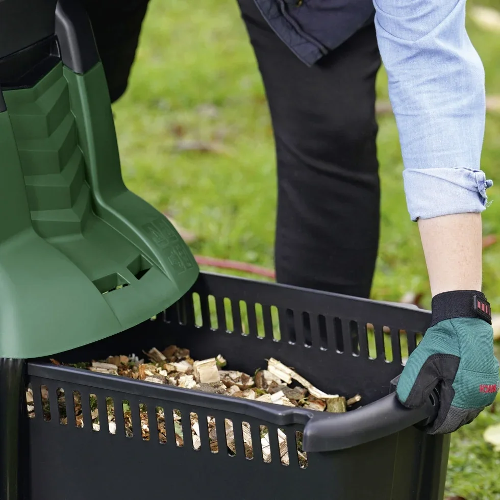 Für unterbrechungsarmes Arbeiten sorgen die große 53-Liter-Fangbox und ein Schnell-Einfülltrichter mit weiter Öffnung. So lassen sich auch größere Mengen an Gartenabfällen komfortabel zuführen, während das Walzenschneidwerk kontinuierlich arbeitet – ohne häufige Leerungen und laut Beschreibung ohne Verstopfungen.