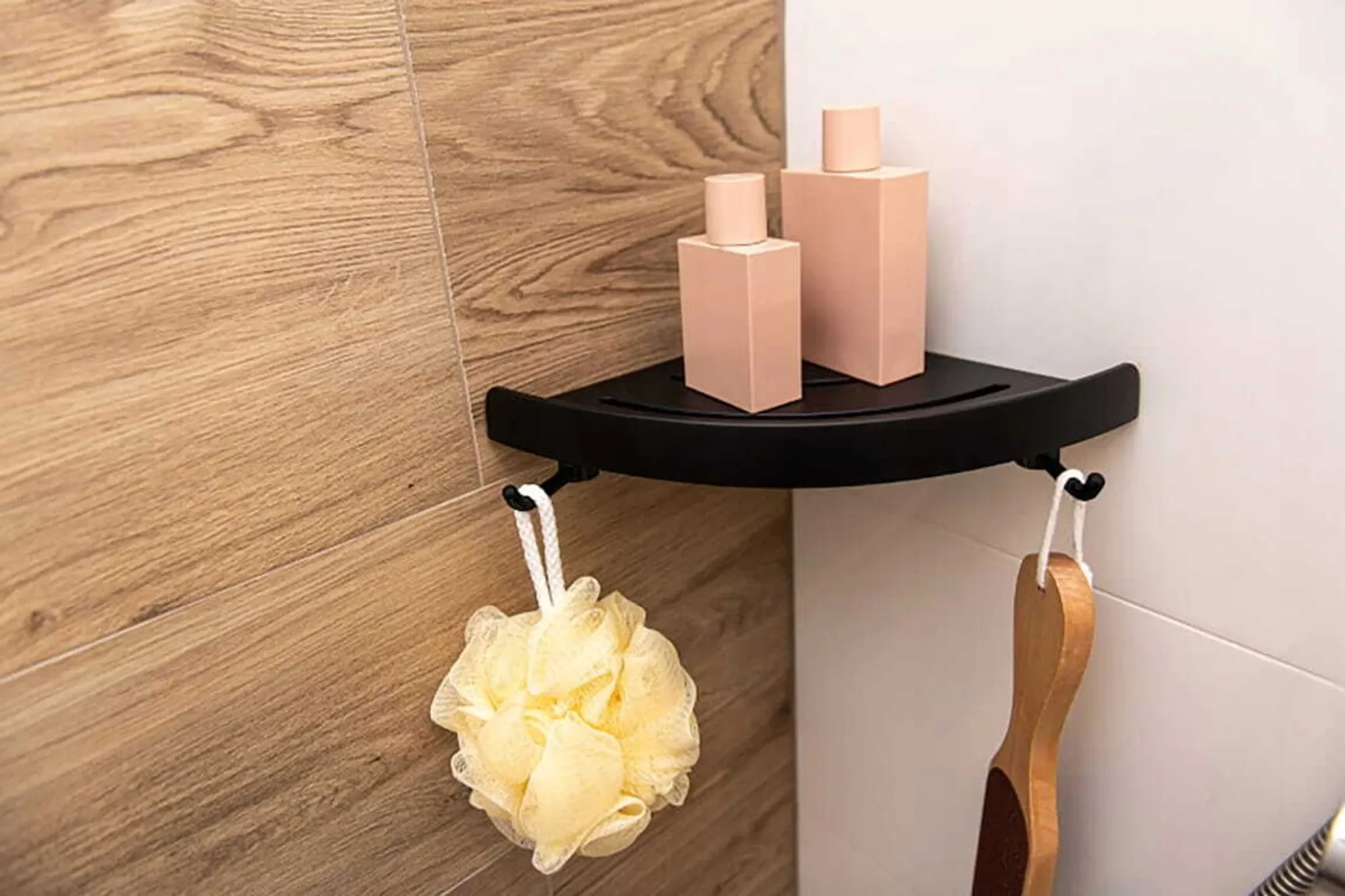 Stilvolles Eckregal für Badezimmer in matt schwarzer Optik. Aus robustem, stoß- und wasserfestem ABS-Kunststoff gefertigt, ideal zur Aufbewahrung von Kosmetika, Badutensilien und kleinen Accessoires. Abflusslöcher sorgen für hygienische Trocknung und einfache Reinigung.