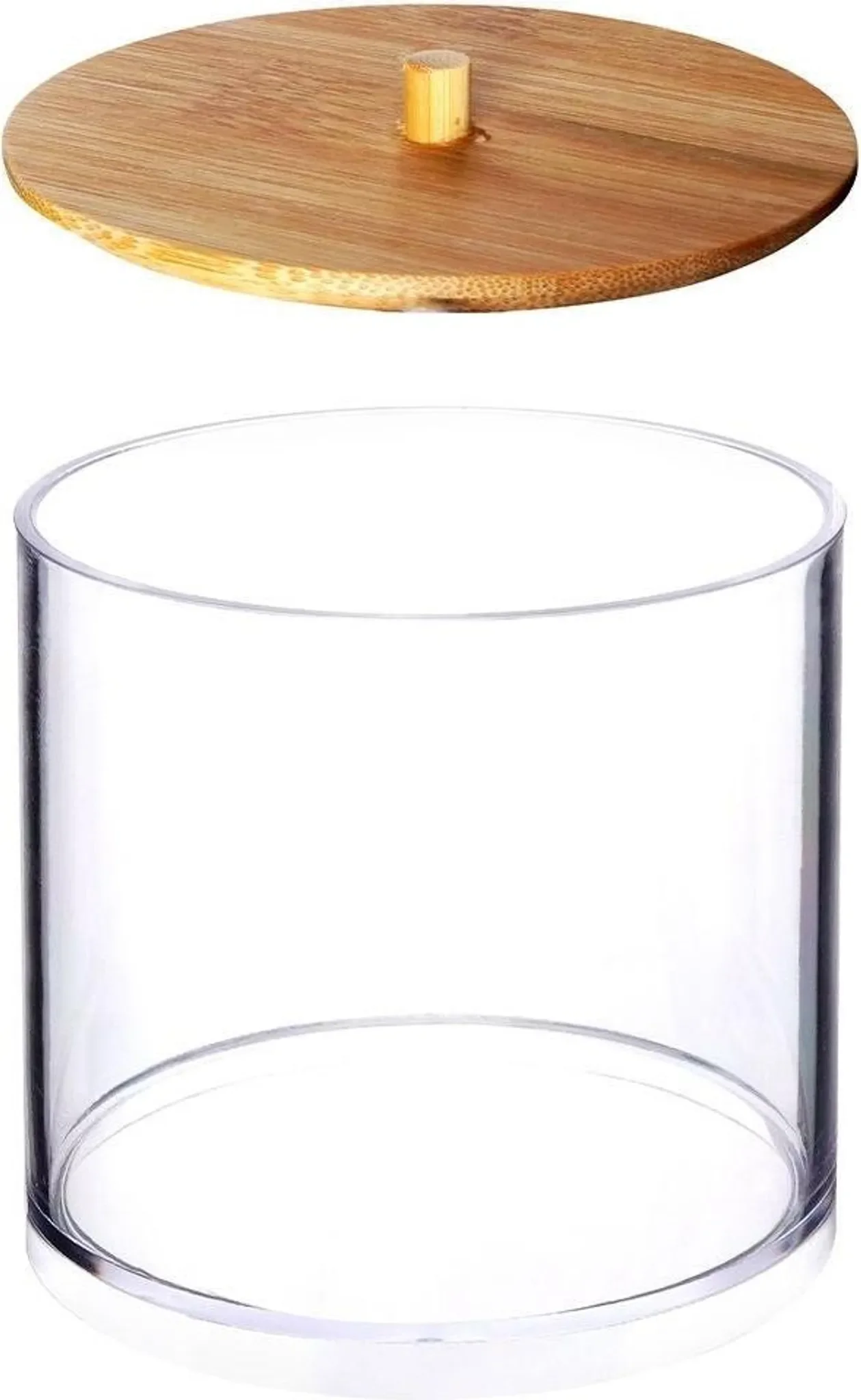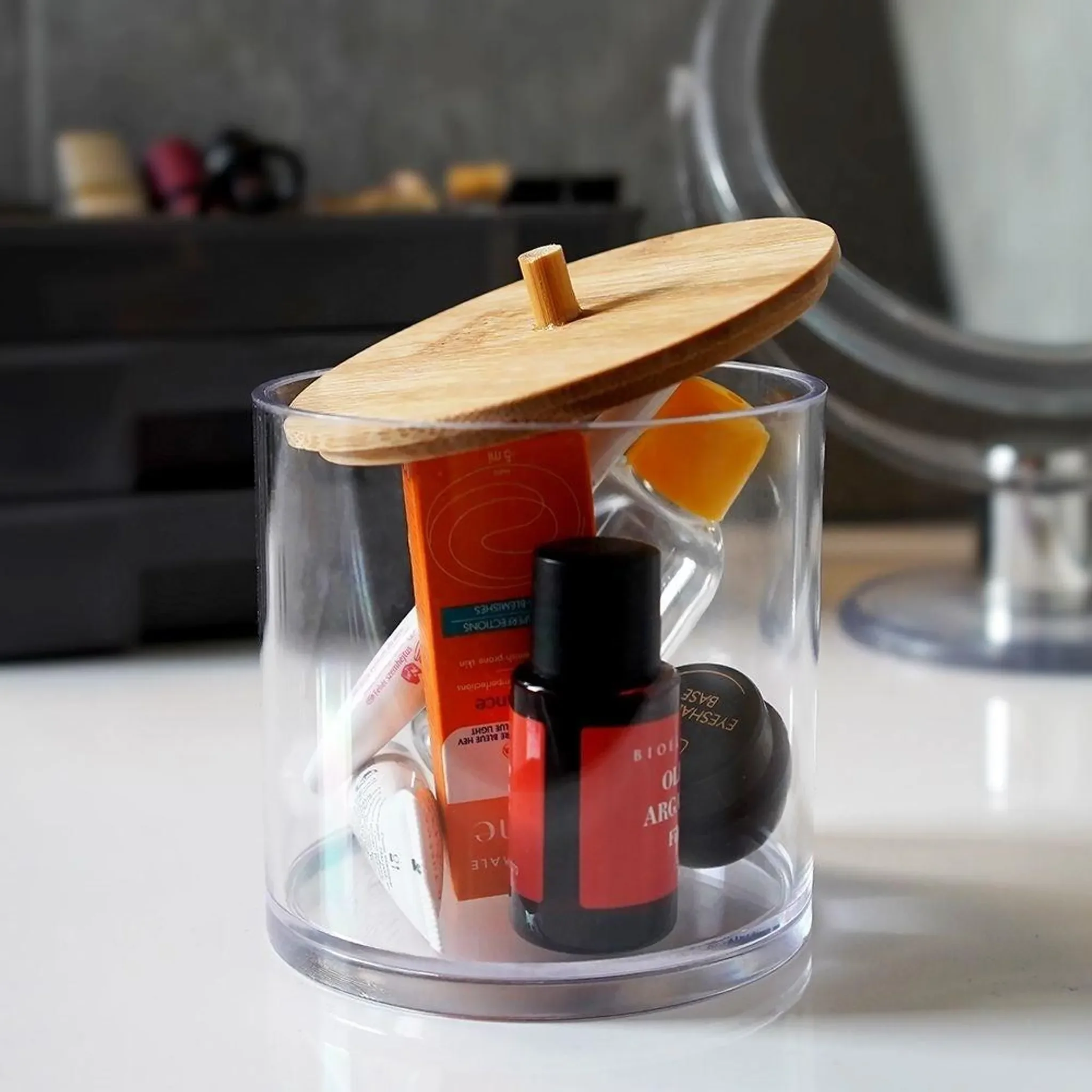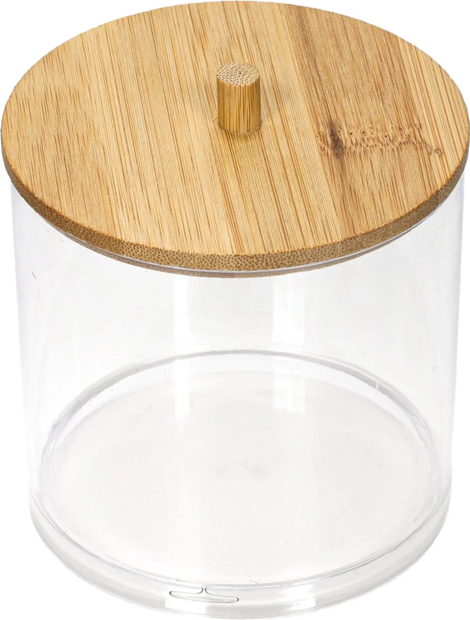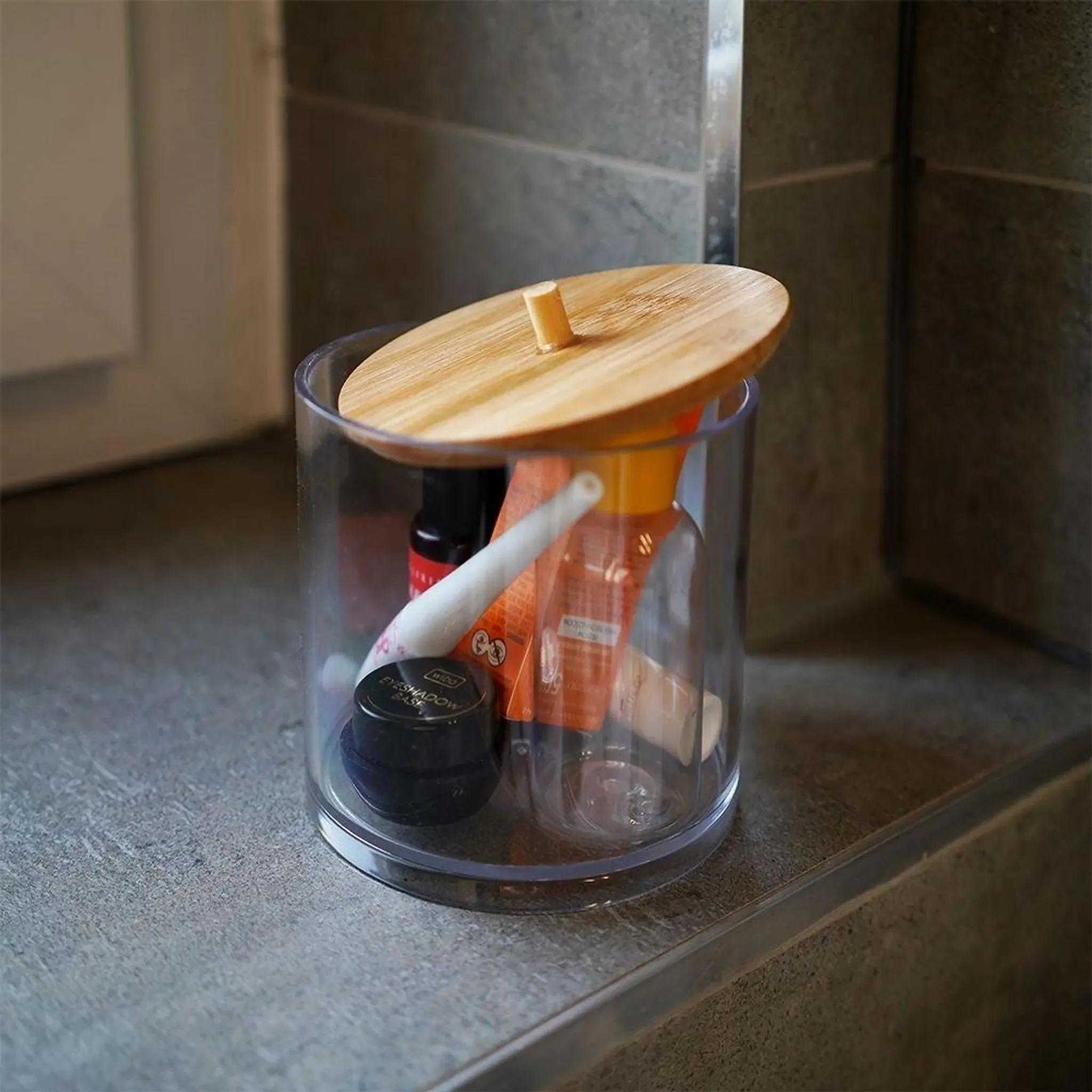 Praktischer Badezimmer-Organizer aus robustem Kunststoff mit elegantem Bambusdeckel. Ideal zur Aufbewahrung von Wattepads, Ohrenstäbchen, Make-up-Zubehör oder kleinen Kosmetika. Die transparente Box erlaubt schnellen Überblick über den Inhalt und der Bambusdeckel schützt vor Staub und Feuchtigkeit.