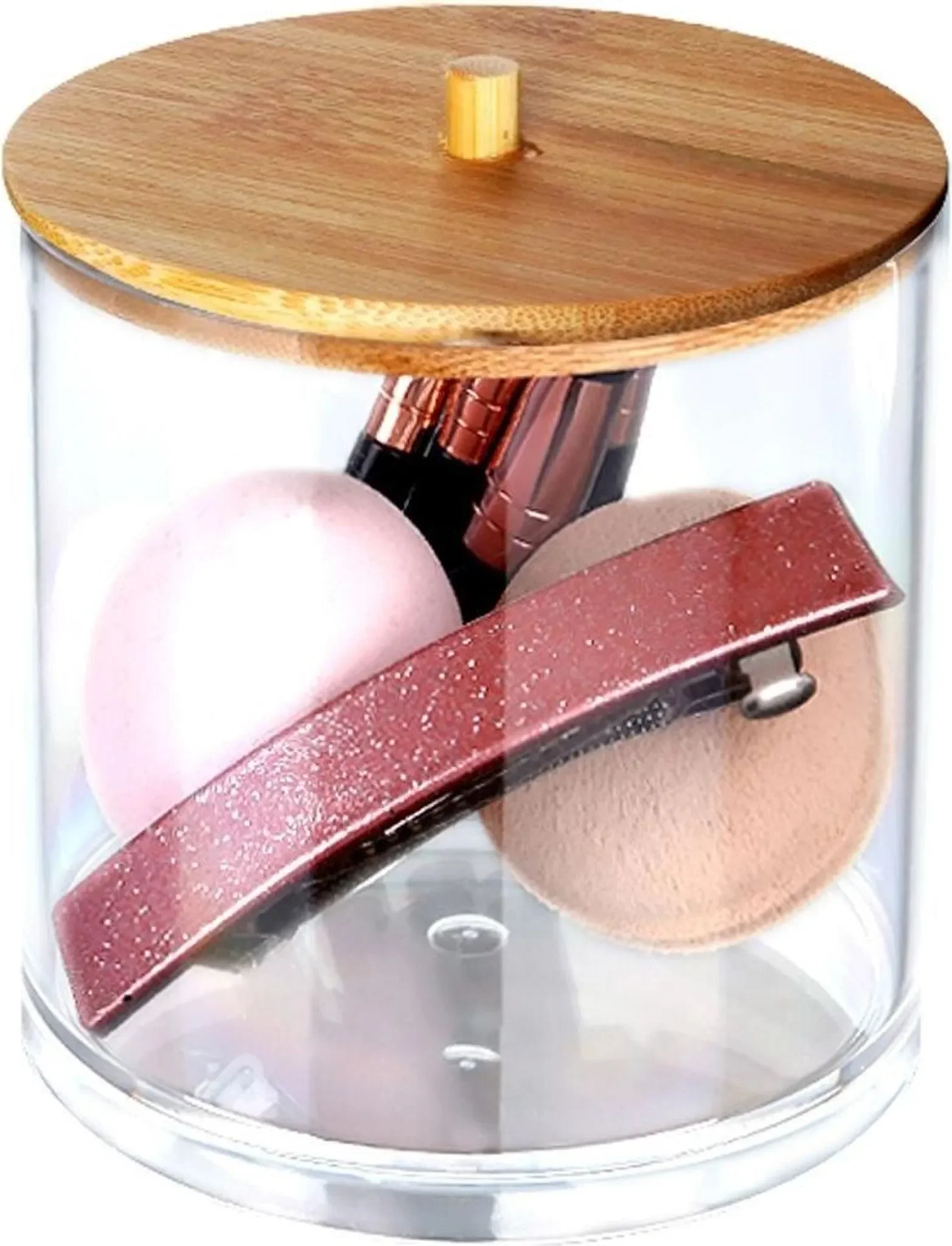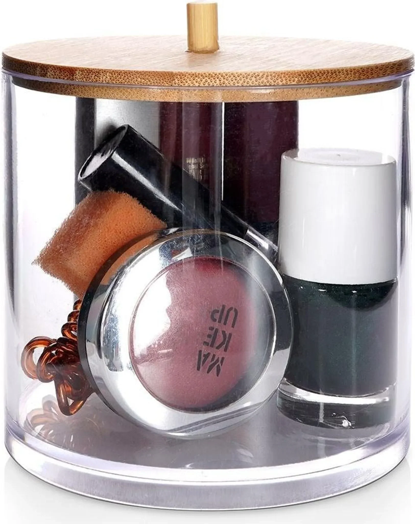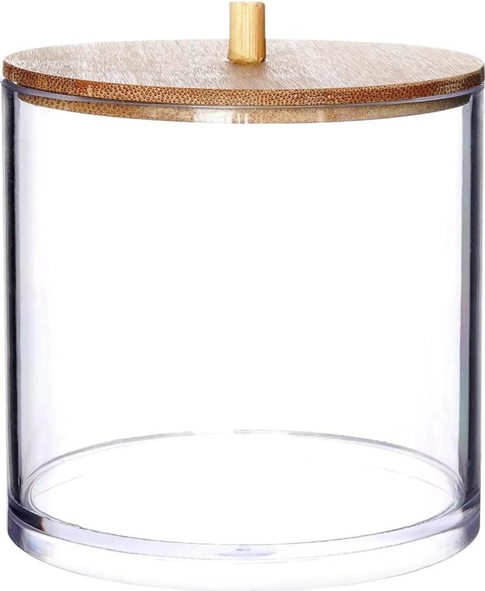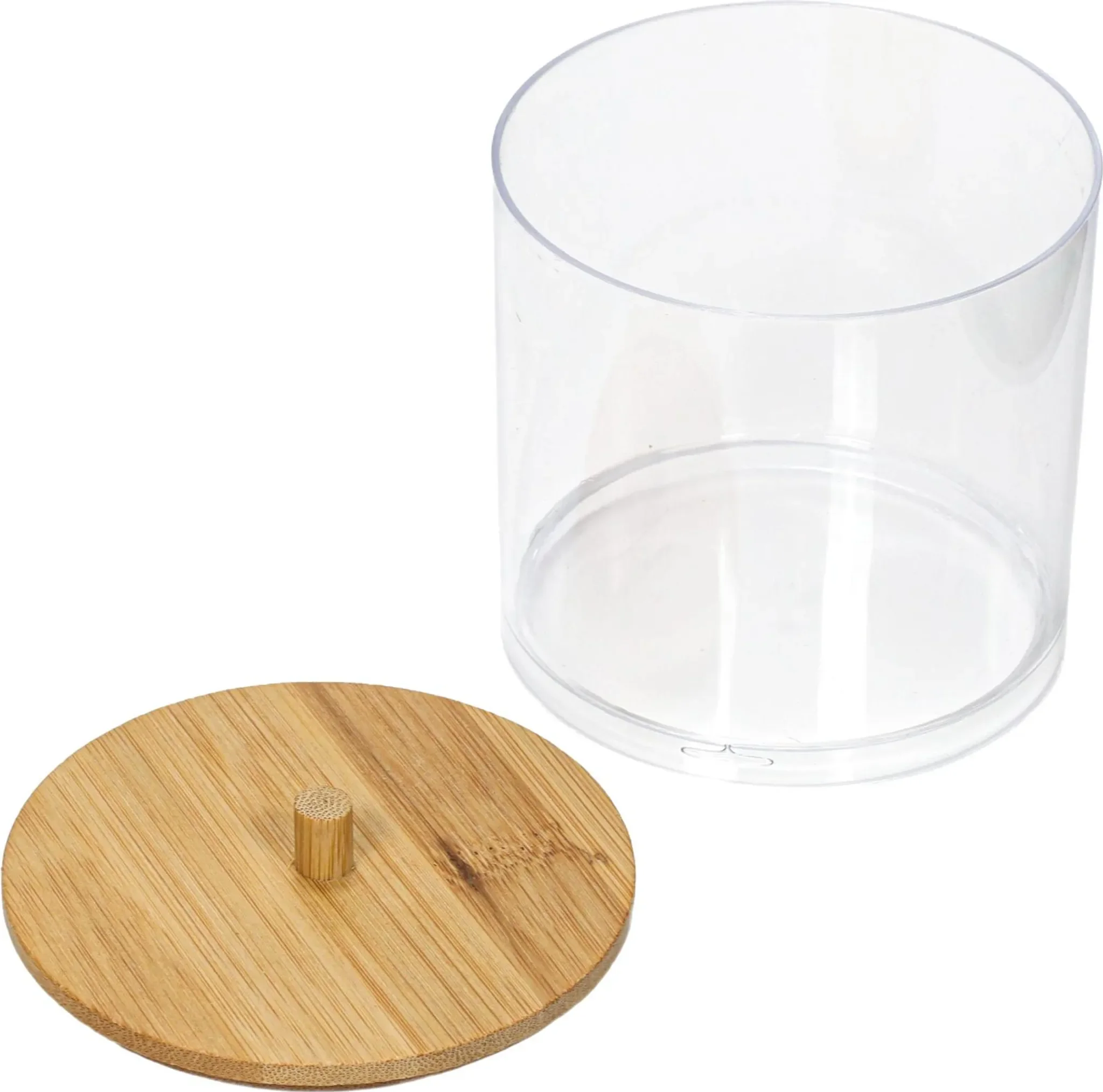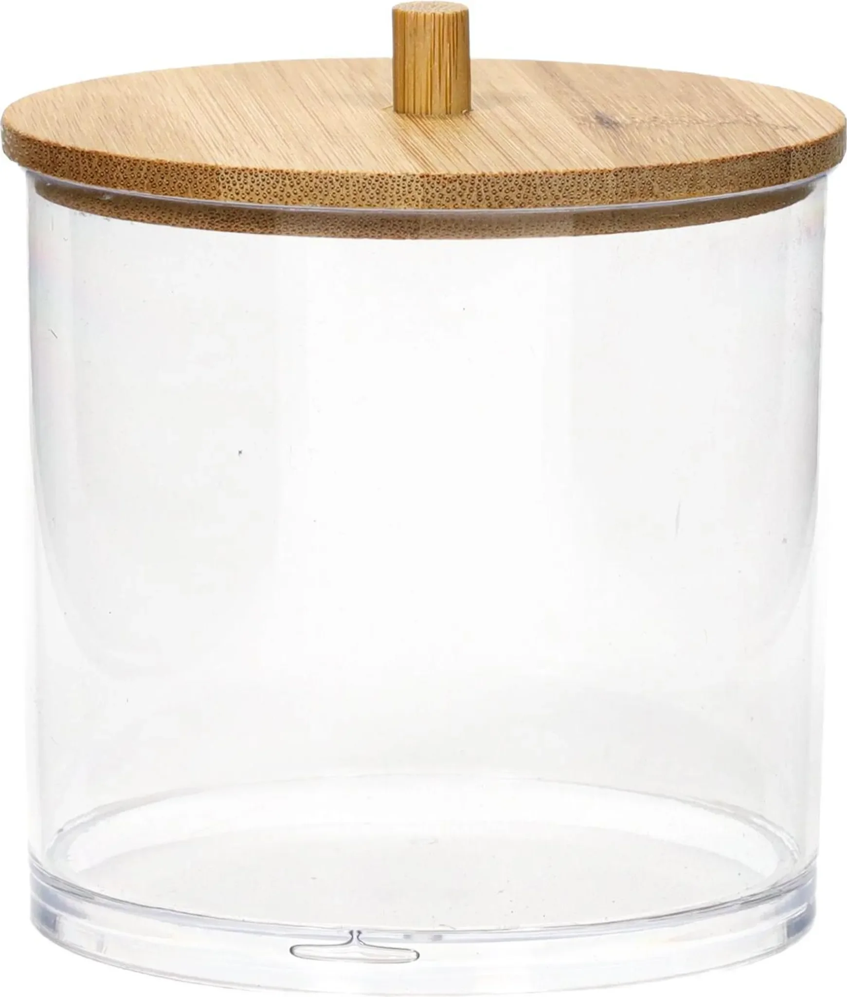 Praktischer Badezimmer-Organizer aus robustem Kunststoff mit elegantem Bambusdeckel. Ideal zur Aufbewahrung von Wattepads, Ohrenstäbchen, Make-up-Zubehör oder kleinen Kosmetika. Die transparente Box erlaubt schnellen Überblick über den Inhalt und der Bambusdeckel schützt vor Staub und Feuchtigkeit.