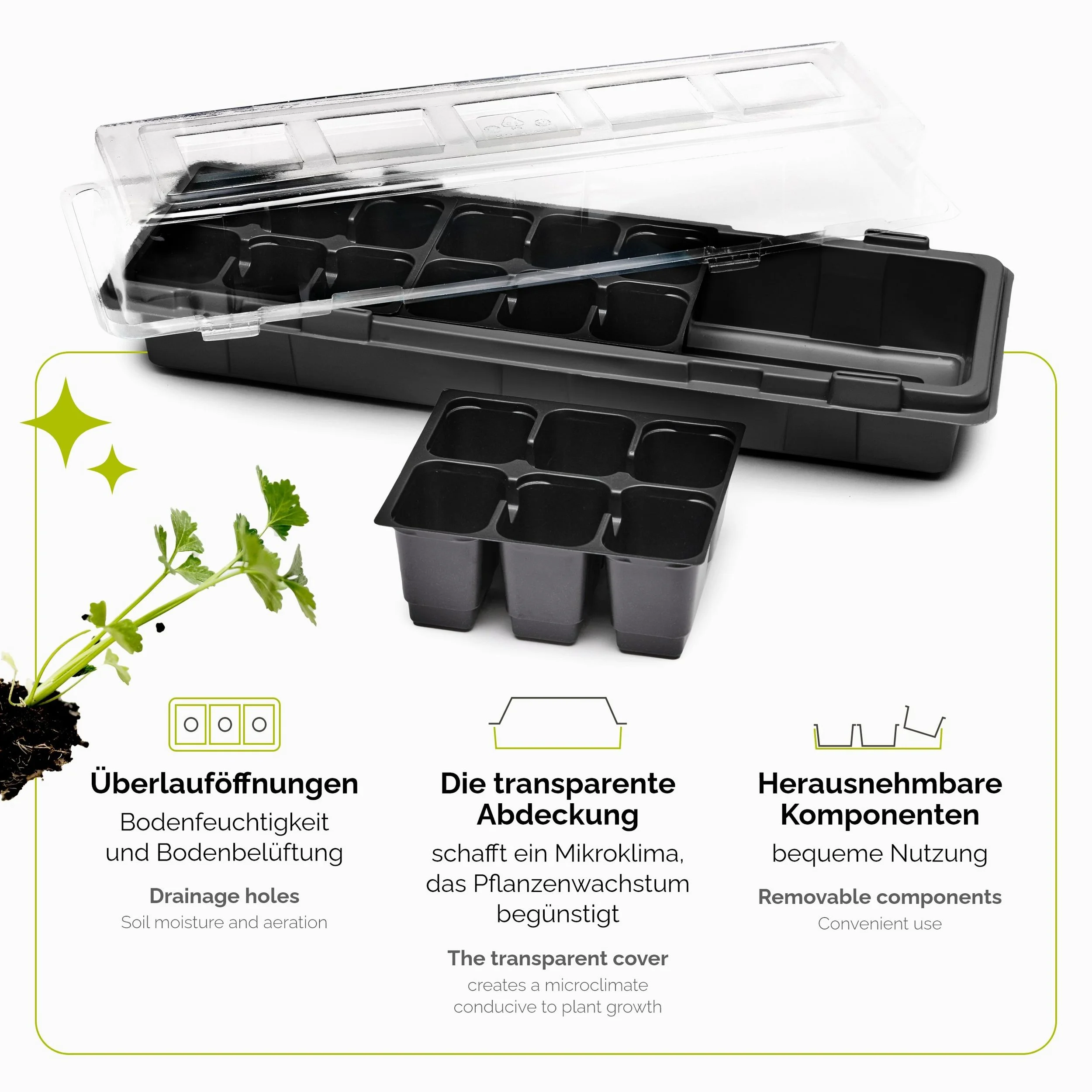 | Ausstattung | Deckel, Anzuchtbehälter, Abtropfschacht, Untersetzer |