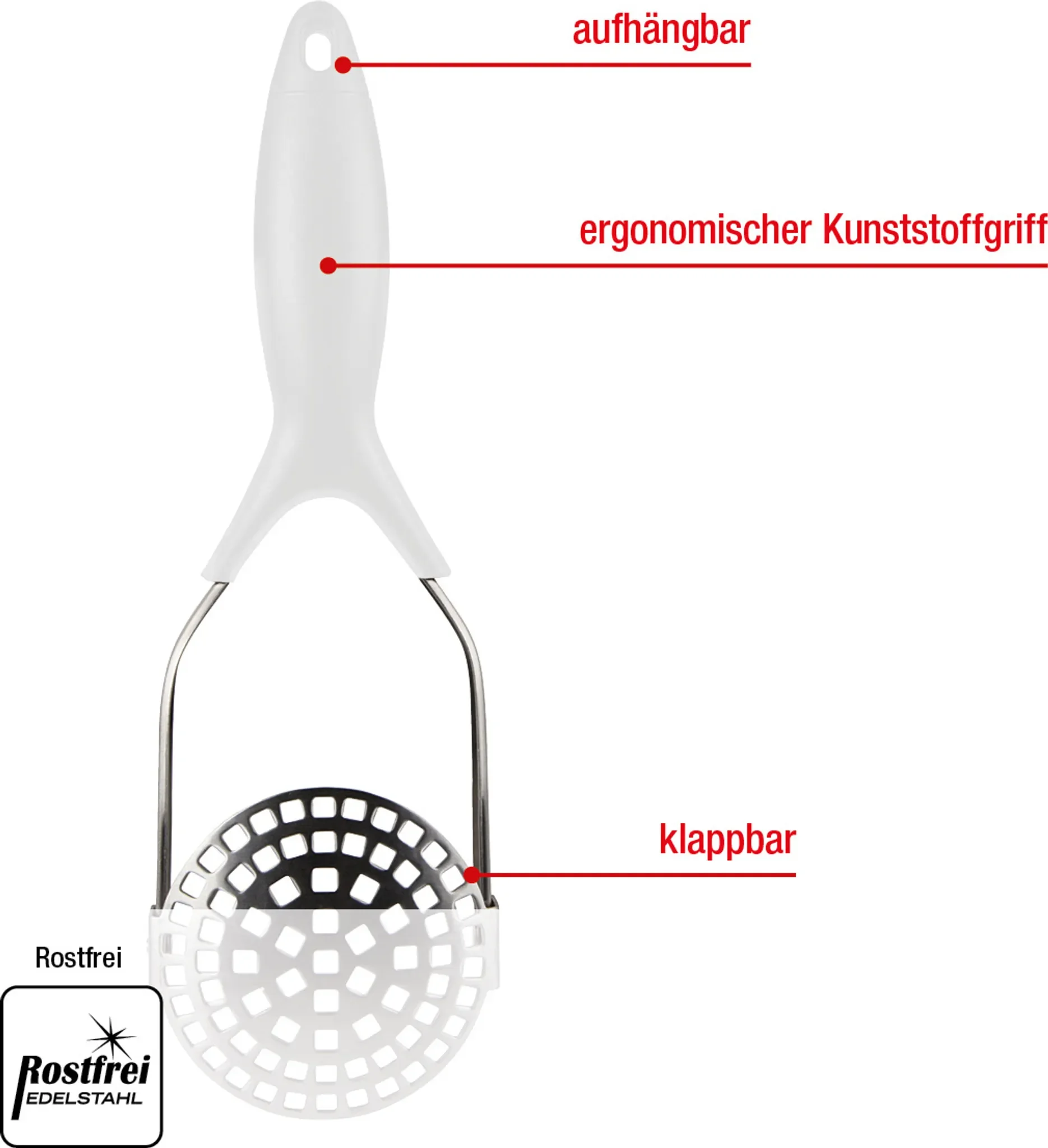 Ein praktisches Highlight ist der klappbare Stampfkopf, der eine platzsparende Aufbewahrung in der Küchenschublade ermöglicht. Zusätzlich verfügt der Griff über eine Aufhängmöglichkeit – ideal für eine ordentliche und griffbereite Küche.