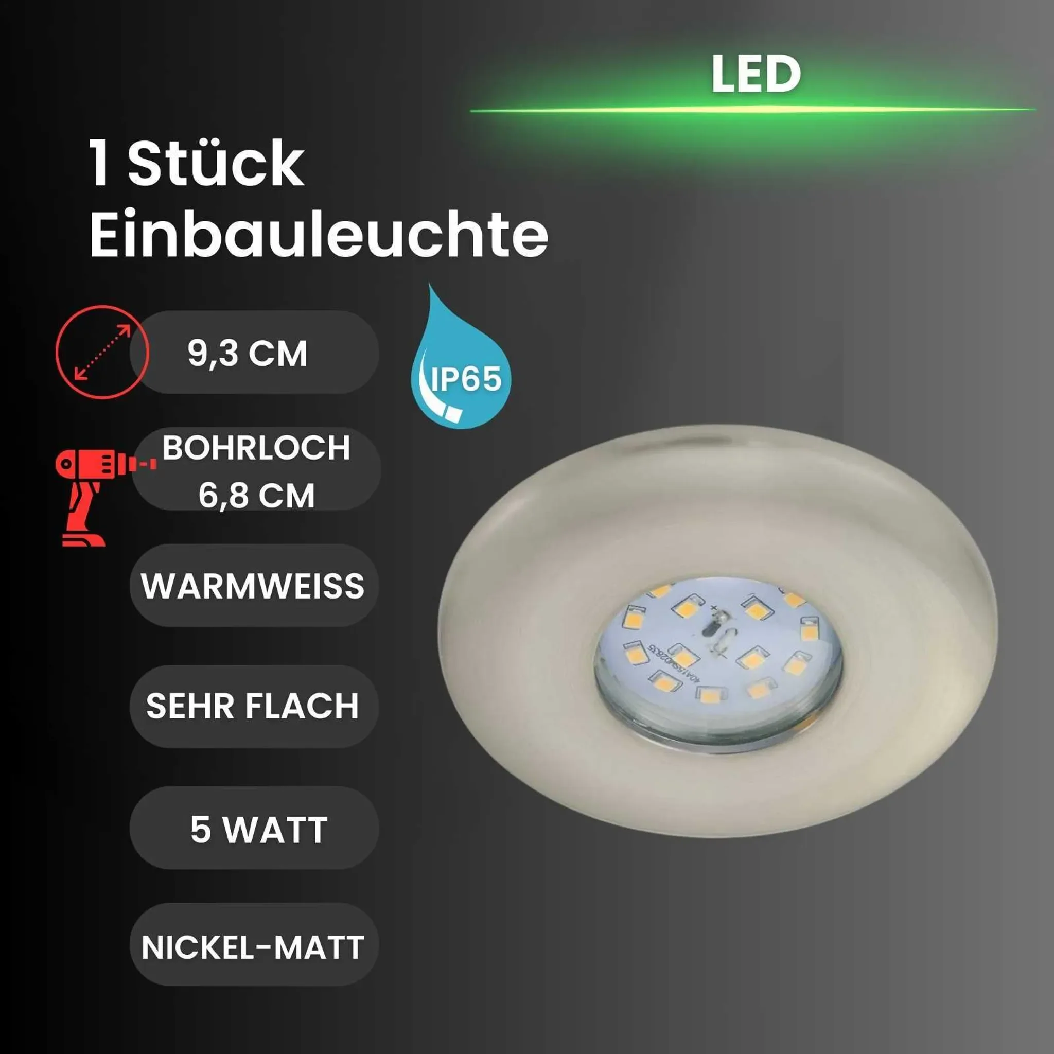 Highlights: Hohe Lichtleistung bei geringer Einbautiefe, IP65-Schutz für Badezimmer, warmweißes Wohlfühllicht, integriertes LED-Modul, direkter Anschluss an 230 V ohne Trafo.