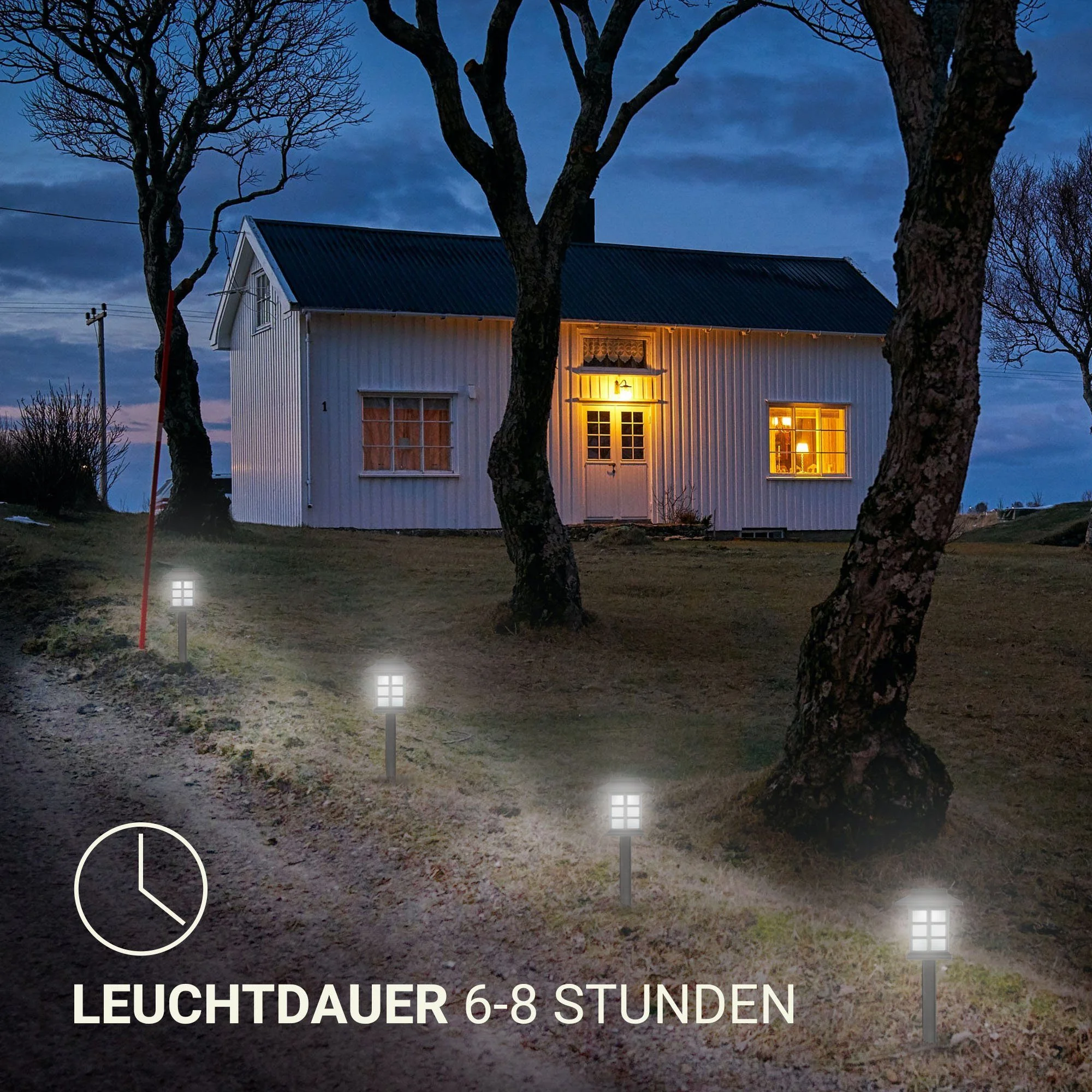Highlights: 100 % solarbetrieben ohne Stromanschluss, witterungsbeständig und korrosionsfest, automatisches Ein- und Ausschalten bei Dämmerung, einfache Installation dank Erdspieß.