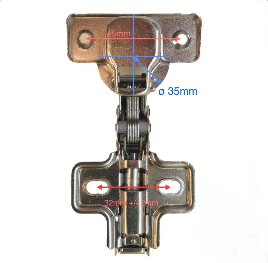 Die Scharniere erleichtern das Ausrichten der Türen und sorgen für eine leise, sanfte und gleichmäßige Schließbewegung. Mit einem Durchmesser der Scharniertöpfe von 35 mm und einem Schwenkwinkel von 110° bieten sie präzise Funktionalität und hohen Komfort in der Anwendung.
