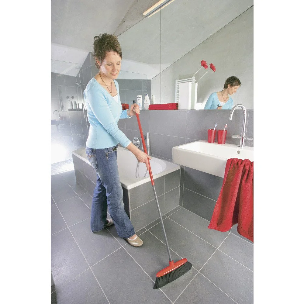 Schwarze Volumenborsten nehmen Staub zuverlässig auf, während graue Aktivborsten besonders effektiv Haare binden. Der integrierte Kantenschutz erleichtert das Kehren entlang von Möbeln und Wänden und sorgt für eine bessere Erreichbarkeit von Ecken.