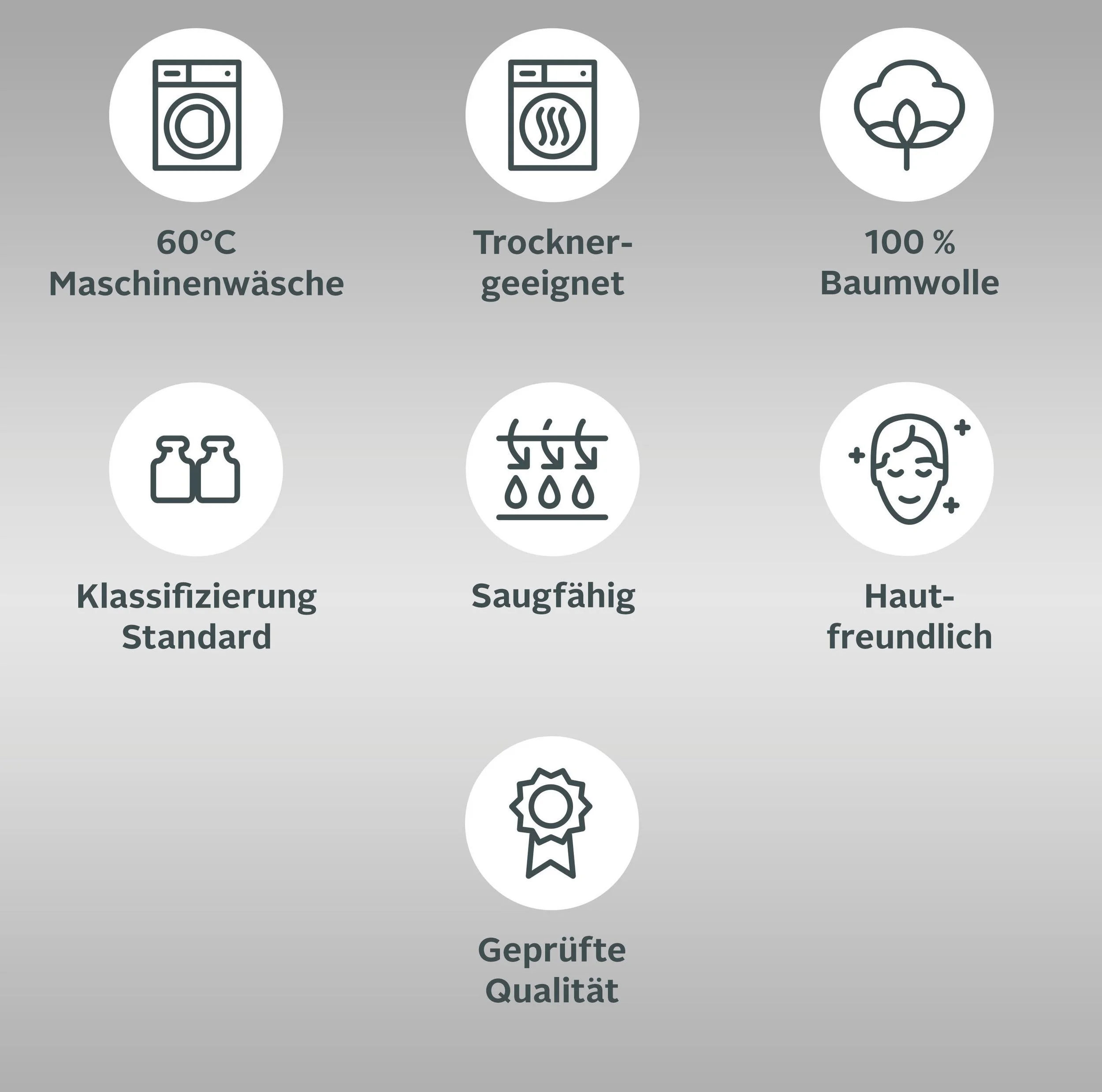 | Pflegehinweis | Maschinenwäsche bis 60°C, trocknergeeignet, mäßig heiß bügeln (150°C), nicht bleichen |