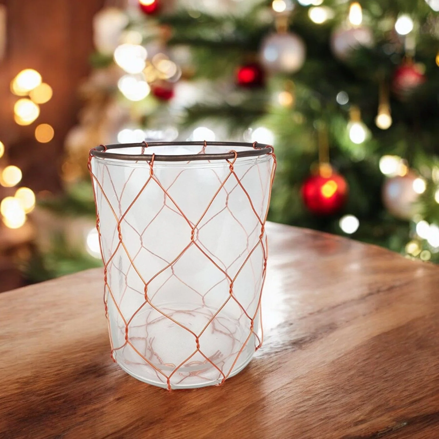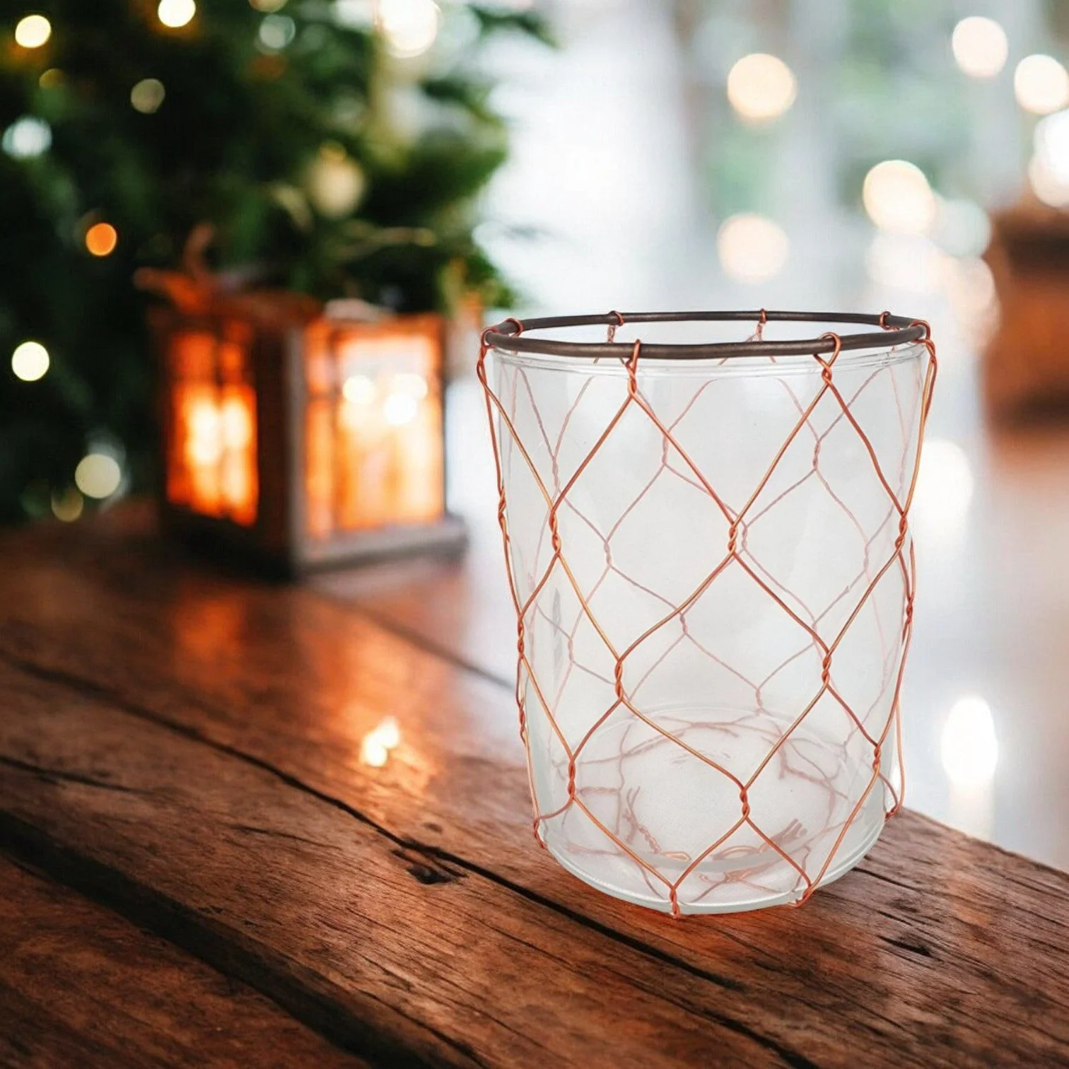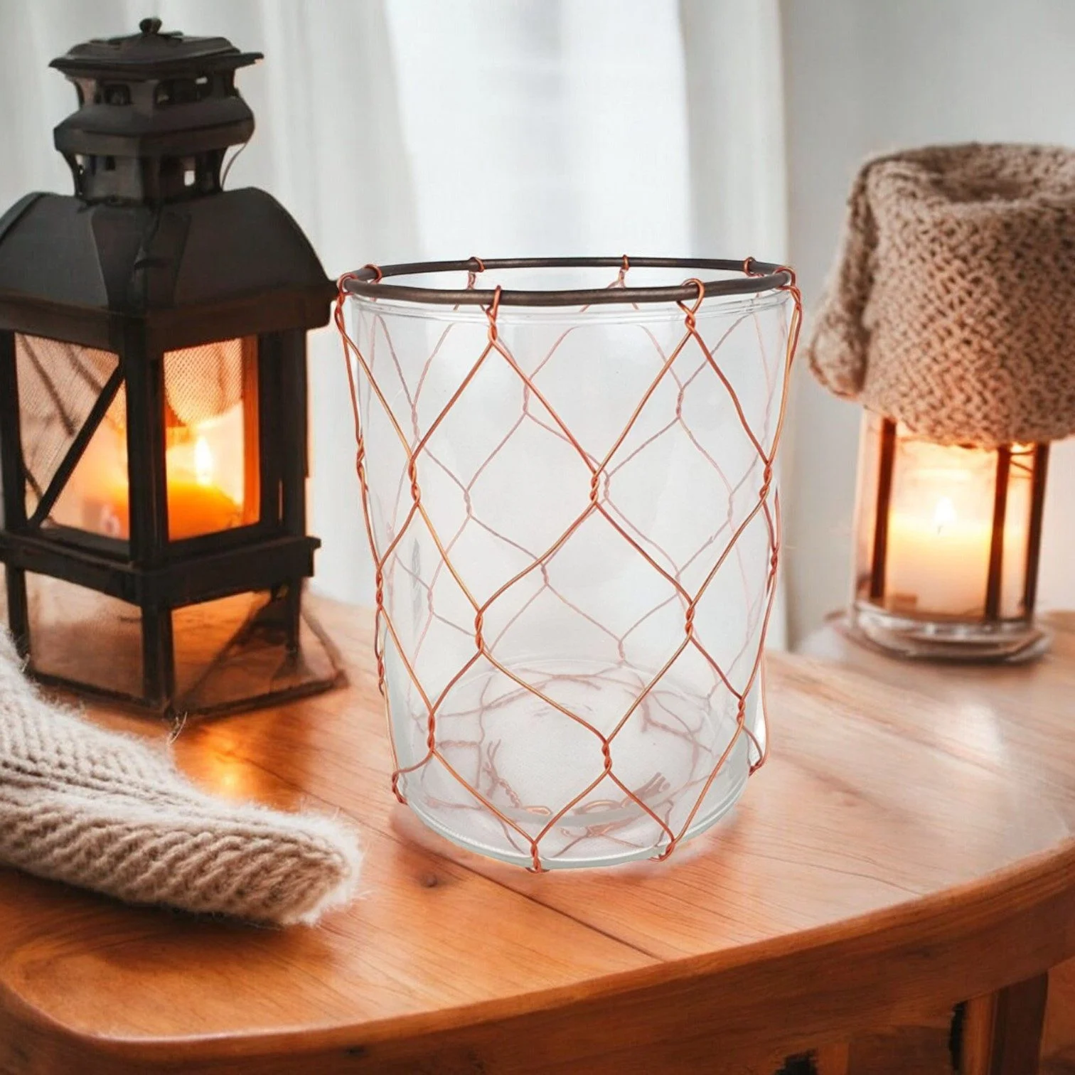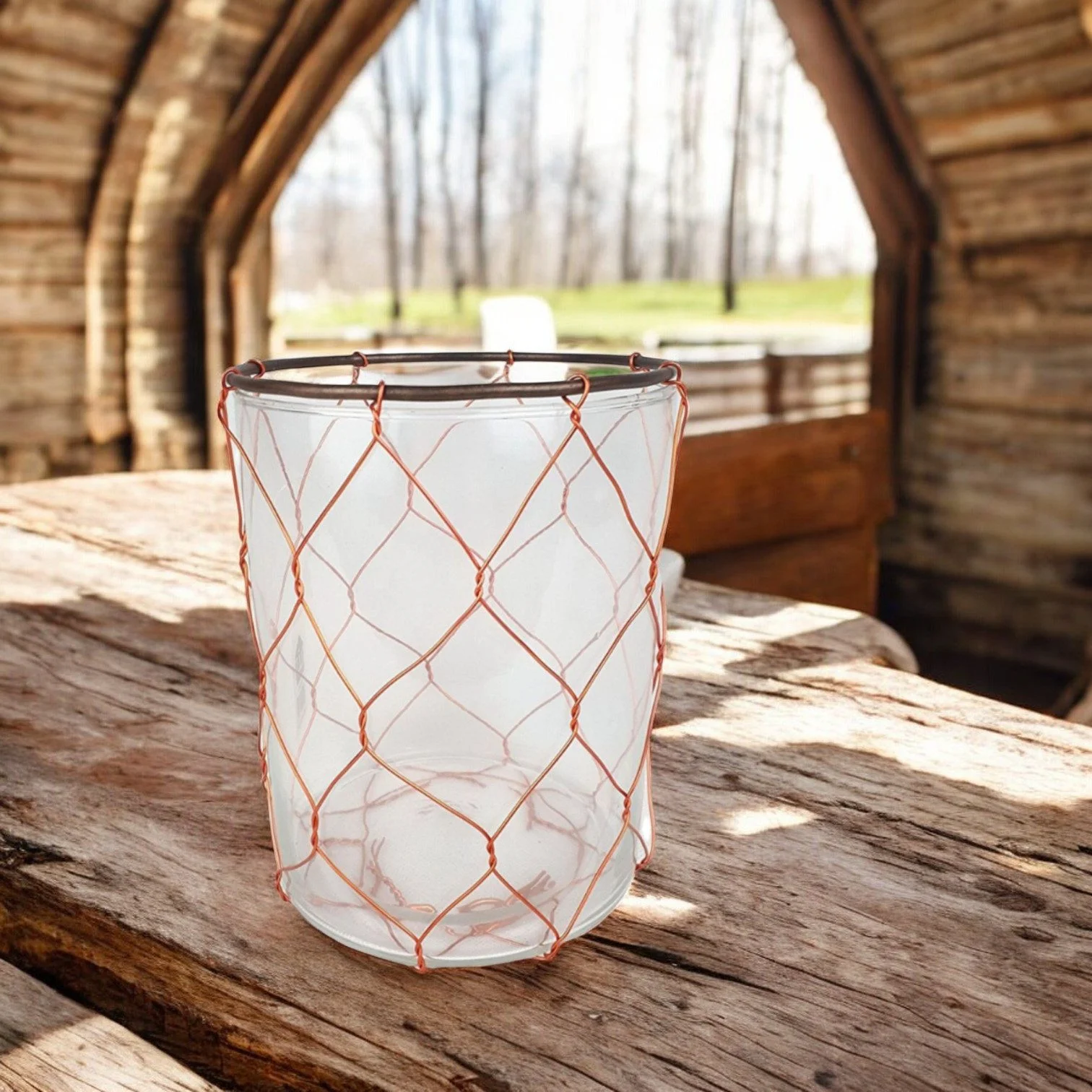 Windlicht aus Glas – 16 cm, mit Kupferdraht & Metallrand